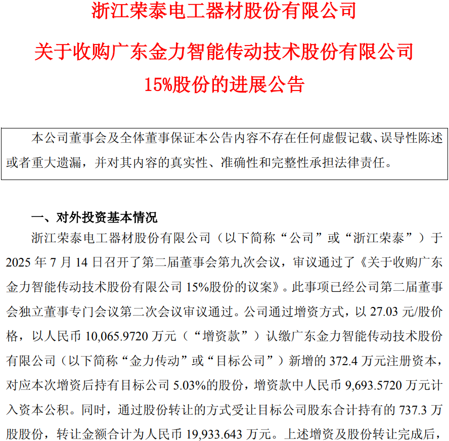 7月23日的一则公告更是引发市场关注:公司已完成收购广东金力智能传动15%股份,借此切入精密传动、智能装备及人形机器人领域。