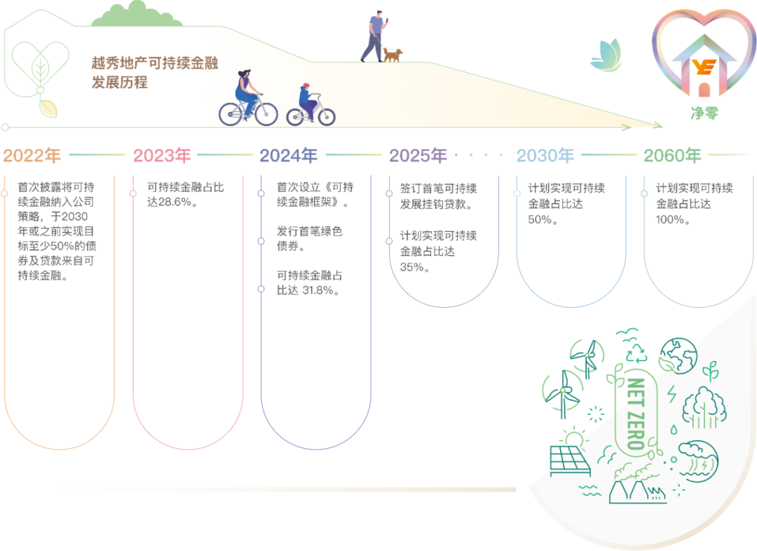越秀地产以系统性战略构建可持续治理框架,在2025年4月正式将“环境、社会及管治委员会”更名为“可持续发展委员会”,进一步推动公司战略与可持续发展深度融合,目前已构建了“董事会-可持续发展委员会-可持续发展领导小组-可持续发展执行小组”自上而下的可持续发展管理架构。在可持续治理体系的推动下,越秀地产持续深化可持续金融布局,不断探索包括绿色债券、绿色贷款以及与可持续发展绩效挂钩的贷款等多种形式的可持续融资手段以支撑公司的可持续发展,继2024年首次设立可持续融资框架并发行首单绿色债券后,越秀地产在2025年6月成功签订首单可持续发展挂钩贷款,致力于到2060年或之前实现可持续金融占比达100%。