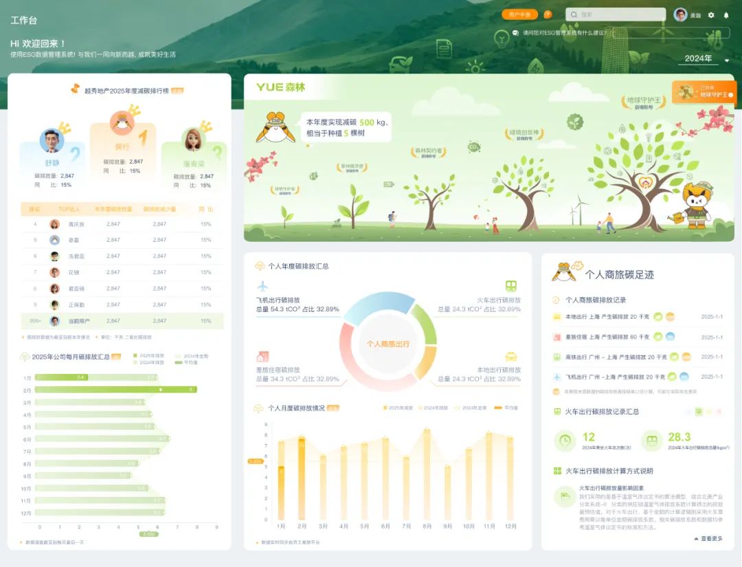 越秀地产深刻认识到房地产企业的生存与发展与自然资源休戚相关,率先参照自然相关财务信息披露(TNFD)框架要求,系统性地开展了自然相关财务信息披露工作,2024年已完成了对全价值链和10个重要项目城市的生物多样性评估,通过资源管理推动生态平衡。同时,为响应“双碳”政策应对气候变化,越秀地产早在2022年便设立了自身的“双碳”目标并在2024年进行了检视更新,以更好的将减碳行动计划深度融入业务全生命周期。为激励全体员工参与气候变化管理,越秀地产在ESG管理系统“个人碳足迹”模块实时统计各员工在商务旅行中的碳排放情况,并根据年度减碳量的大小分等级授予“绿荫守护者”等不同的荣誉称号,践行绿色低碳出行。