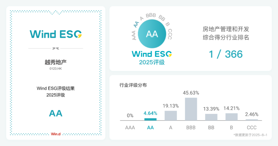 近日,万得(Wind)正式发布2025年ESG评级结果,越秀地产(0123.HK)凭借在环境治理、社会责任与公司治理(ESG)领域的卓越实践,获得Wind ESG “AA”评级,ESG综合得分跃居至房地产管理和开发行业366家参评企业中的第一位,引领房地产可持续发展新标杆。